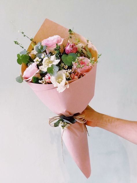 手渡しギフトに最適な、可憐なミニサイズの花束。受付・カウンターへの飾りや、オープニングパーティーでの贈り物におすすめです。淡いピンクとホワイトを基調にした花々を、やさしい色合いのラッピングペーパーで包んで華やかに仕上げました。