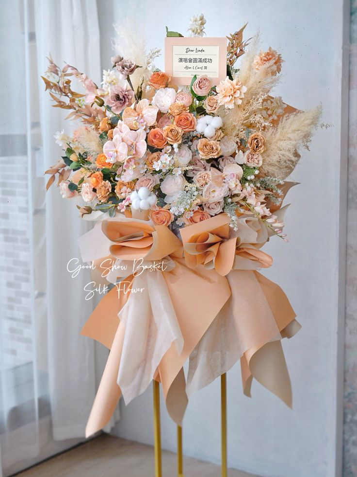 存在感抜群の特大サイズスタンド花。淡いオレンジやピーチカラーの花々がボリューム豊かに咲き誇り、新規オープンや式典の場を一気に華やかに彩ります。リボンやラッピングペーパーもカラーコーディネートされ、高級感ある仕上がりです。