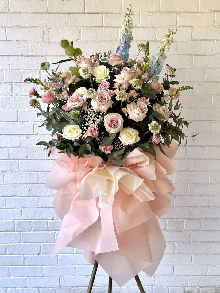 ふんわりとしたピンクを基調に、ボリュームたっぷりの花々を美しくまとめたスタンドタイプのアレンジメント。飲食店や美容サロンの開店祝いに最適で、足元には上品なカラーペーパーをあしらい、華やかさを演出します。